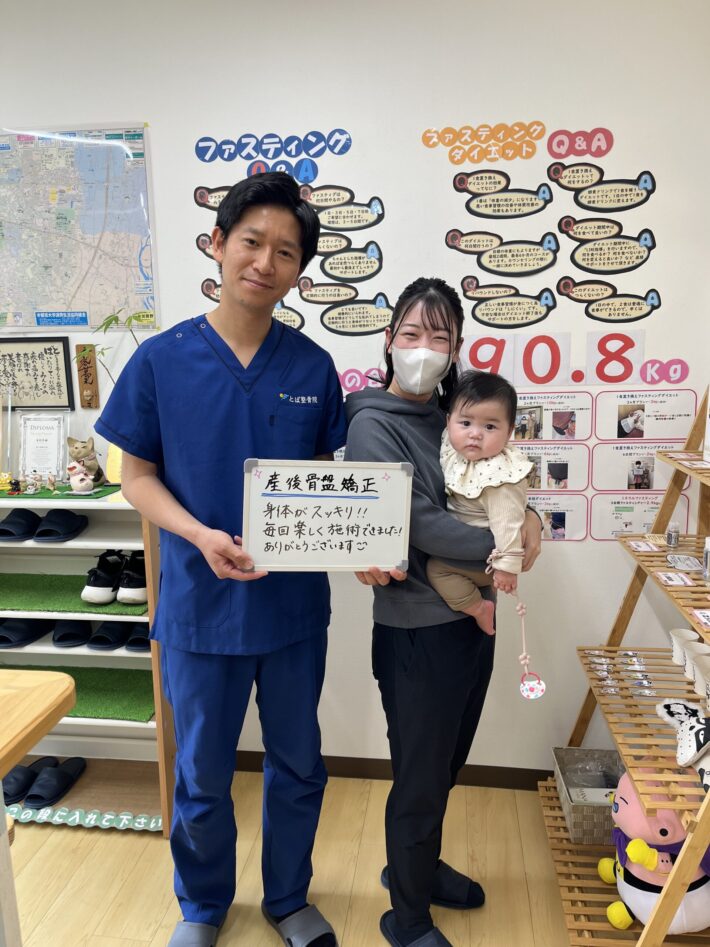 鳥羽先生には高校生の頃にもお世話になりましたが、今回は母となり出産後の骨盤矯正の方で施術していただきました!出産前から気になっていた骨盤の症状も改善し、また先生にお願いしてよかったと思っています!鳥羽先生、女性スタッフのお二人、ありがとうございました*\0/*またよろしくお願いします