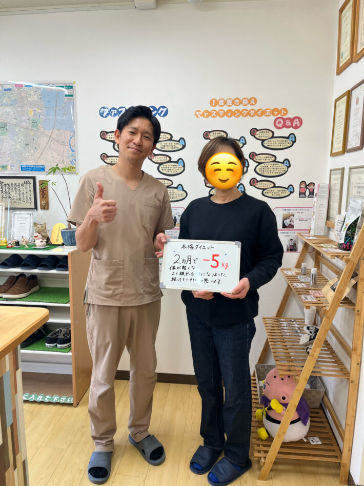 食べる事大好き、そして何より年齢的に不安もありましたが、期間中は毎日アドバイスいただき、スタッフにも励まされ、2ヶ月後には目標を達成することが出来ました